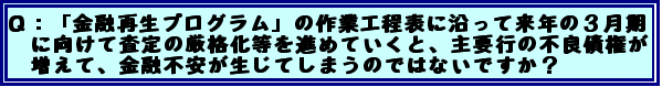 | A | :10月30日に公表した「金融再生プログラム」(注1)について、今般、その着実な実現に向けて実施のスケジュールを「作業工程表」(注1)として取りまとめました。 今後、この「作業工程表」に従い、「金融再生プログラム」を着実に実施し、平成16年度に不良債権問題を終結させることを目指します。これにより、日本の金融システムと金融行政に対する信頼を回復し、構造改革を支えるより強固な金融システムを構築してまいります。 さらに、政府としては同プログラムの実施にあわせ、先般公表した「改革加速ための総合対応策」(注1)を着実に実施し、安心して国民が暮らし、企業が事業に専念できるよう、あらゆる手段を尽くして対応してまいります。 ご質問は具体的にはDCF(注2)によって、要するにDCF的手法の採用によってどういう影響が出るのかというご指摘だと思います。これはまさに「工程表」の中で、この具体的な、技術的な問題を公認会計士協会を中心に議論をしていただく(注3)。それで、来年3月期決算に間に合うようにしていただこうということです。それに当たっては、幅広く専門家の意見を聞くということでありますから、現時点で、今、私の立場でどうこうという見通しを申し上げるのは難しいというふうに思っております。 しかし、この手法につきましては、既に一部の銀行で採用されているということもありまして、これは着実に実施されていくことによって、資産査定の厳格化を通して非常によい効果が出てくると思っております。それによって、弱体化する銀行があるかどうかということでありますが、現時点でそのようなことは全く想定をしておりません。現時点ではそういった財務上の問題が生じるというふうには、そういう弱い状況にはないというふうに考えております。むしろそうした時期にこそ、しっかりと資産査定を強化して、銀行の経営基盤を固めていっていただきたいというふうに思っております。 |