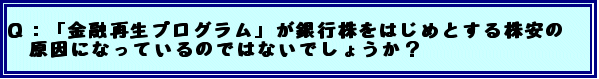 | A | :基本的に、今の銀行に関しては資金面とか自己資本の面で、これはもちろん一生懸命不良債権の処理はしていただかなきゃいけないんですが、現状で、そういった健全性等々について問題があるというふうには思っておりません。 やはり我々がやるべきこと、銀行にもやっていただかなきゃいけないことは、基本的には「金融再生プログラム」を、「金融再生プログラム」というのは、資産査定をきっちりとやりましょうと、ガバナンスをしっかりとやりましょうということですから、これは恐らく資産査定をちゃんとやらないでおきましょうとか、ガバナンスを強化しないでおきましょうなどという議論は、これはあり得ない議論だと思います。そういうことをやっていくということは、これは当然必要な方向なのであって、それについて、その「再生プログラム」の具体化、これを「工程表」等々で詰めるところは詰めていくし、その具体化の中身を受けて、やはり銀行にしっかりした対応をしていただく、経営のシナリオをしっかりと示していただく。そういう中で、銀行の株に対しても、マーケットでやはり次第に正しい評価をしていただけるようになると。銀行の収益力向上等々の努力が示されて、それを市場が評価していくというふうになるというふうに考えております。 ただ、株式市場というのは、やはりその方向感を得るのに少し時間がかかるというのは、どこの国でもそうであるし、どの時代でもそうであったかと思います。よく例に出させていただきますけれども、スウェーデンで銀行に対して今は非常に高く評価されている政策をとってから1年間株は下がり続けたと。その後、突如上がり出して4倍ぐらいになったと。そういう株の方向感を得るためのタイムラグというのはやはりあるのだと思います。先程も申し上げましたように、「金融再生プログラム」を実行することによって日本の金融システムは間違いなく強くなると。その過程で、「工程表」等々でどのような細目でやっていくのかということをやはり明示して、それを受けて、銀行の方でも明解な収益力向上のための、健全化のためのシナリオを示していただく、そうした中で、長期の均衡価格、これはもっと高いところにあると、日本の株全体としてかなりもっと高い水準にあると私は確信をしておりますけれども、そういうところに向かった新しいダイナミックな動きが出てくるのであろうというふうに思っております。 そういう正しい方向への流れを一刻でも早く実現するために、したがって、これはマクロ経済政策の観点から、デフレ抑制のためのしっかりとした措置も要るでしょうと。だから今、補正を含めた論議を始めているわけで、来年度の先行減税についても同じような視点が必要だと思いますし、何よりも、早く銀行の「工程表」等々で示せることを明示していきたいというふうに思っておりますので、これは早い時期にそういう方向感が出てくるということを期待をしております |