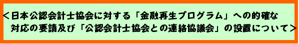 | (注) | 「金融再生プログラム」においては、主要行の不良債権処理によって、中小企業の金融環境が著しく悪化することのないよう中小企業貸出について十分配慮し、各種のセーフティネットを講じることとしております。詳しくは  「金融再生プログラム−主要行の不良債権問題解決を通じた経済再生−」(平成14年10月30日)、「「金融再生プログラム」について」(広報コーナー)にアクセスしてください。なお、金融庁においては中小企業など借り手の声を幅広く聞くために、「貸し渋り・貸し剥しホットライン」を開設し、貸し渋り・貸しはがしに関する情報を電子メール・ファックスで受け付けております(電子メール:joho@fsa.go.jp 、FAX:03-3506-6699)。 |