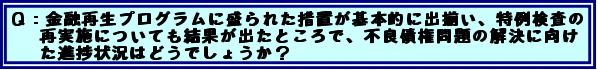 | A | :自己査定が大事だということ、そこはしっかりとやっていただきたい。これは決算期に我々がその時期に一緒に資産査定に加わることによって、我々なりの査定の結果を示して、前回もそうでありましたように自己査定と我々の査定についてギャップがあればそれを出していく。その中で自己査定が非常にしっかりしたものになってくるという、そういう性格のものだと思います。現実にいろんな査定を一巡目二順目我々の検査を重ねる中でそのギャップは縮まる傾向にありますので、我々が資産の厳格化を求めて検査をしっかりとやっていくと、その中で自己査定そのものが大変しっかりしたものになりつつあると、そのように理解すべきなのではないでしょうか。 理想的には特別検査をしなくて良い状況が出現するというのが理想であろうかとは思います。ただ、今の時点ですぐにこれを止めるのが良いことかどうかというのは、直ちには判断できないと思っております。我々としては2年後にこの問題の終結を図りたいと、その目標に向かって資産査定の厳格化、自己資本の充実、コーポレートガバナンスの強化、これをしっかりとやって行っていただきたい。そのための検査・監督を続けたいと思います。 |