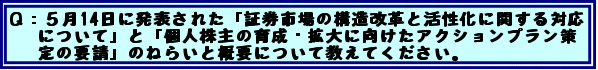 | ※ | 「証券市場の構造改革と活性化に関する対応について」の本文をご覧になりたい方は、首相官邸ホームページの「主な報告書・答申等」から「証券市場の構造改革と活性化に関する対応について(平成15年5月14日)」)にアクセスしてみてください。また、「個人株主の育成・拡大に向けたアクション・プラン策定の要請」の本文をご覧になりたい方は、金融庁ホームページの「報道発表など」から「個人株主の育成・拡大に向けたアクション・プラン策定の要請」(平成15年5月14日)にアクセスしてください。 |