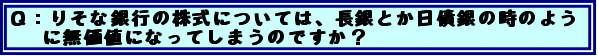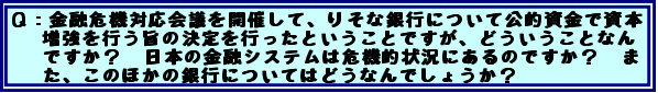 | A | :長銀の時に行ったように、国が全部その株を取得してしまって、その他の株主の価格がゼロになるというような措置、そういう措置とは全く違うわけです。そのような意味では、いわゆる国有化ではなくて、これは公的な支援として公的資金を入れるわけです。繰り返しますが、株式の数を減らすとかですね、長銀の時に行ったように株主の権利がゼロになるとか、そういう意味での減資というのは全くあり得ないことだと思っております。 |