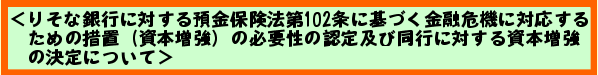 | 1 | .りそな銀行に対する資本増強の必要性の認定 平成15年5月17日、金融危機対応会議の議を経て、りそな銀行について預金保険法第102条第1項に基づく資本増強の必要性の認定が行われるとともに、同行が資本増強の申込みを行うことができる期限が平成15年5月30日と定められました。 りそな銀行に対する資本増強の必要性の認定は、破綻状態にない金融機関に資本増強を行い、健全性の回復を図り、これにより、我が国及び同行が業務を行っている地域の信用秩序の維持に極めて重大な支障が生ずることを未然に防ぐためにとられたものです。金融庁としては、今後とも、金融システムの安定を確保していくとともに、預金者の保護、信用秩序の維持に万全を期すこととしております。 | ||||||||||||