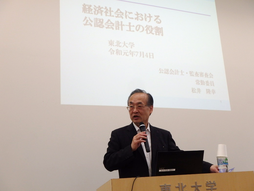 令和元年7月4日、東北大学経済学部において、松井委員が「経済社会における公認会計士の役割」をテーマとして講演を行い、多数の学生の皆さまに御出席いただきました。
