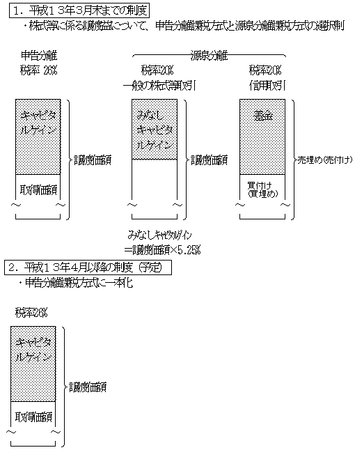| 株式等の譲渡所得等の課税については、平成11年度税制改正において、平成11年3月末をもって有価証券取引税等を廃止するとともに、上場株式等に係る譲渡所得等の源泉分離選択課税制度については、平成13年3月末までの経過措置とされたところであるが、我が国経済における株式市場の重要性の高まり、各種金融商品に係る課税の中立性の確保、申告分離課税への一本化が株式市場に与える影響等に鑑み、源泉分離選択課税制度を維持する。 更に、源泉分離選択課税制度を維持した上で、株式市場の活性化や課税の中立性確保のため、どのような制度の改善がありうるかについては、欧米諸国における関連税制も参考としつつ、株式取引の実態を踏まえ、検討する。 | |||||||||