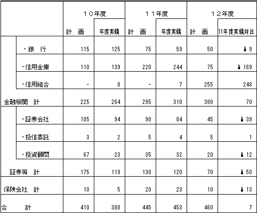 | 4 | .検査基本計画のポイント 平成12検査事務年度の主な業態に対する検査実施予定数を定めた検査基本計画、及び10、11検査事務年度における検査基本計画と実績の対比は、別表のとおり。 本事務年度の検査実施予定数を昨事務年度の実績と比較すると、信用組合集中検査に重点的に検査要員を投入するため、信用組合の検査実施予定数が大幅に増加している一方、その結果、他業態は概ね減少しており、合計では若干の増加となっている。 なお、検査実施計画は、当初計画として設定しているものであり、金融機関等を取り巻く現下の厳しい経営環境下において適時の実態把握に的確に対応するため、弾力的な運用を行うこととしていることから、実施予定数は変動することがあり得る。 【別表】検査計画と実績の対比 | |||||||||||||||