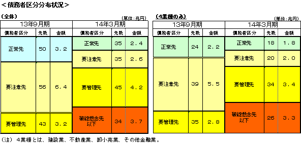 <特別検査の結果> 上記方針のもと、検証を行うことが適当と考えられる一定の客観的条件に該当する債務者は、149社、与信額は12.9兆円ありました。 このうち、約半数の71社(7.5兆円)が、昨年9月期と比べて債務者区分が下位に移り、そのうち34社(3.7兆円)は破綻懸念先以下になりました。これらによる不良債権処分損は1.9兆円となっています。 |