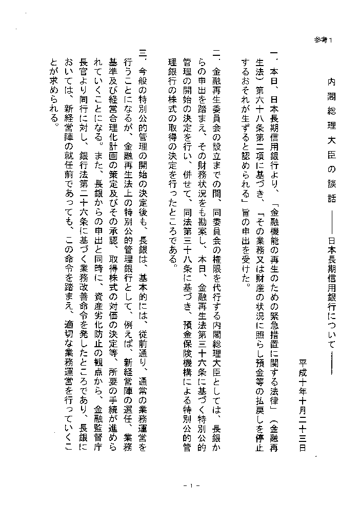 1(1) 本日、日本長期信用銀行から内閣総理大臣に対して「金融機能の再生のための緊急