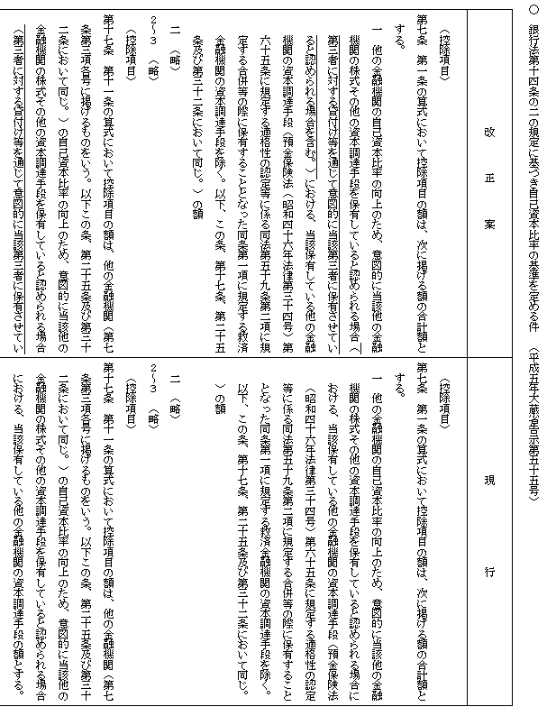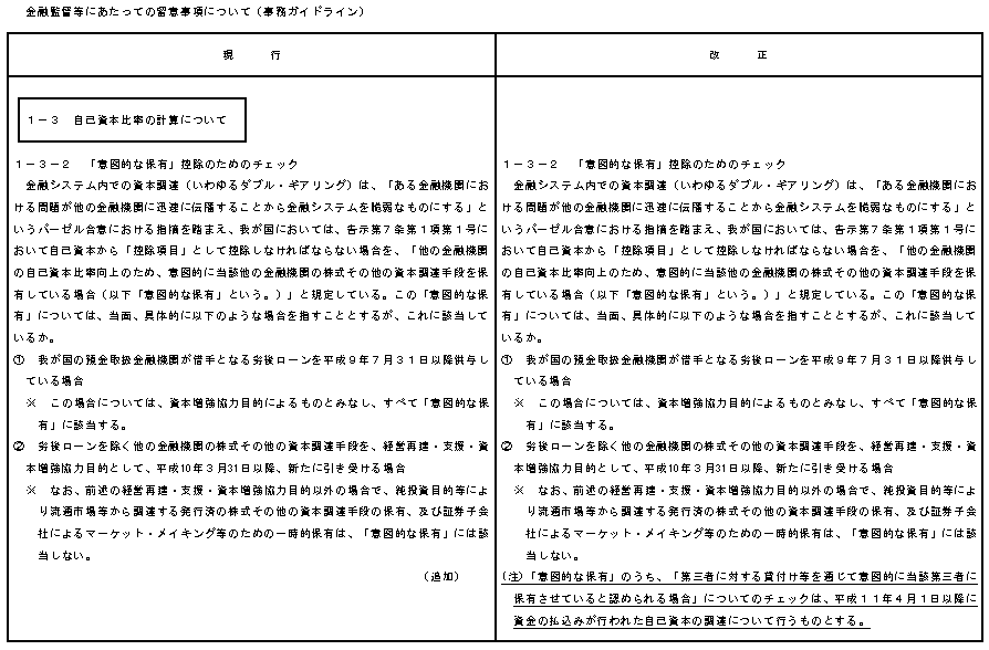 | 今回の改正が何時から適用され るのかを明確にするべきであ る。 | 平成11年4月1日以降に資金の払込みが行われ た自己資本の調達から適用される。 (⇒事務ガイドラインに記載する。) |