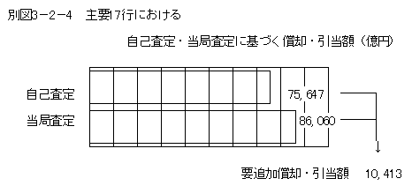 | (5) | 償却・引当の適切性 償却・引当の適切性については、自己査定が正確に行われていないほか、償却・引当基準自体に問題が認められたことなどから、全行について償却・引当額の追加が必要であると認められた。
