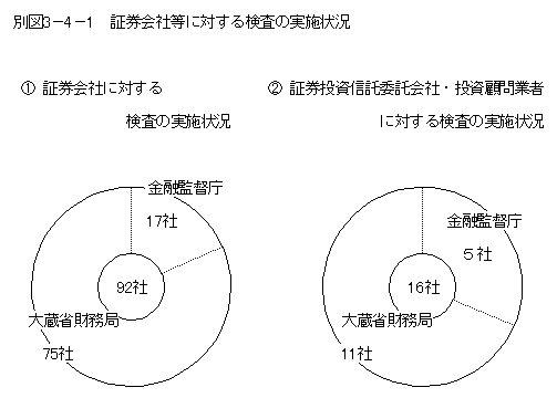 平成10検査事務年度においては、平成10年5月31日現在で、金融監督庁と大蔵省財務局がそれぞれ着手したものをあわせて、証券会社92社と証券投資信託委託会社・投資顧問業者16社となっており、このうち証券会社60社、証券投資信託委託会社・投資顧問業者7社に対して検査結果を通知している。