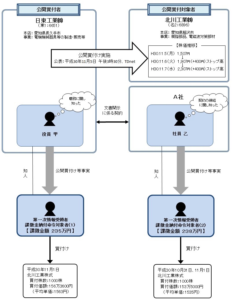 課徴金納付命令対象者(1)は、日東工業株式会社(以下「日東工業」という。)の役員である甲から、同人がその職務に関し知った、日東工業の業務執行を決定する機関が、北川工業株式会社(以下「北川工業」という。平成31年3月22日上場廃止)株式の公開買付けを行うことについての決定をした旨の公開買付けの実施に関する事実の伝達を受けながら、前記事実が公表された平成30年11月5日より前の同月1日、自己の計算において、北川工業株式合計1000株を買付価額合計156万3600円で買い付けたものである。