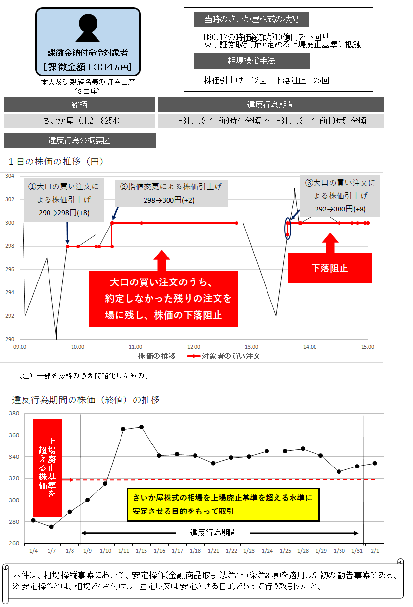 課徴金納付命令対象者は、株式会社さいか屋株式の相場を、株式会社東京証券取引所が定める上場廃止基準を超える水準に安定させる目的をもって、別表記載のとおり、平成31年1月9日午前9時48分頃から同月31日午前10時51分頃までの間、16取引日にわたり、大口の高指値買い注文を発注することにより、他の投資者が発注していた売り注文を買い付けることで直前の約定値より株価を引き上げるとともに、その後に他の投資者が発注した売り注文と同買い注文とが順次約定することで同指値未満に株価が下落することを阻止するなどし、同株式合計6万9500株の買付けの委託を行うとともに、同株式合計2万2700株を買い付け、そのうち、自己の計算において、同株式合計6万9200株の買付けの委託を行うとともに、同株式合計2万800株を買い付け、もって、同株式の相場を安定させる目的をもって、一連の売買及び委託をしたものである。