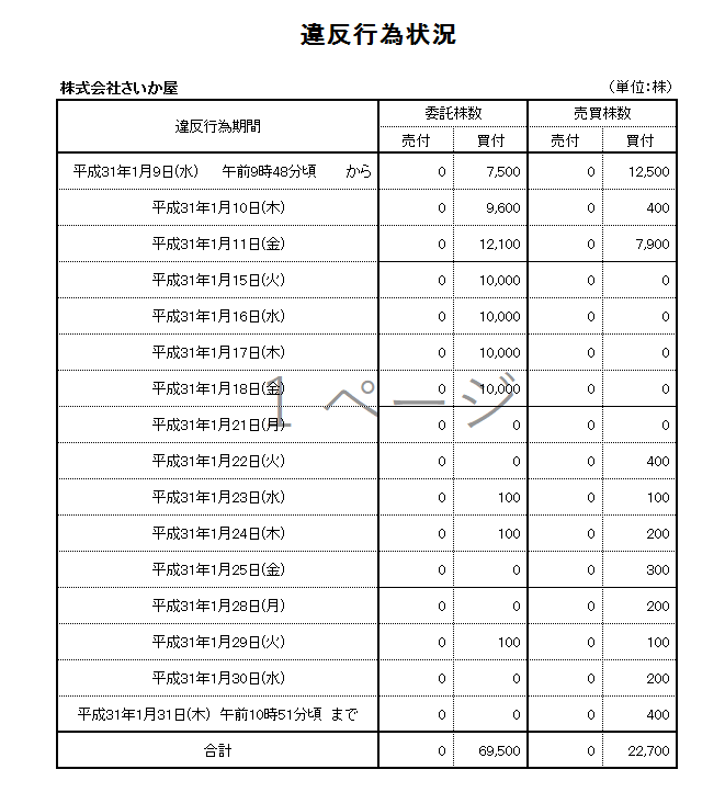(1) 当該違反行為に係る自己の計算による有価証券の売付け等の数量は、当該違反行為期間中に係る自己の計算による有価証券の売付け等の数量0株に、金融商品取引法施行令第33条の14の8第5項の規定により、当該違反行為に係るものとみなされる、違反行為が終了した日から1月以内に違反者が自己の計算において行った有価証券の売付け等の数量0株を加えた0株であり、